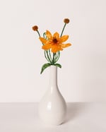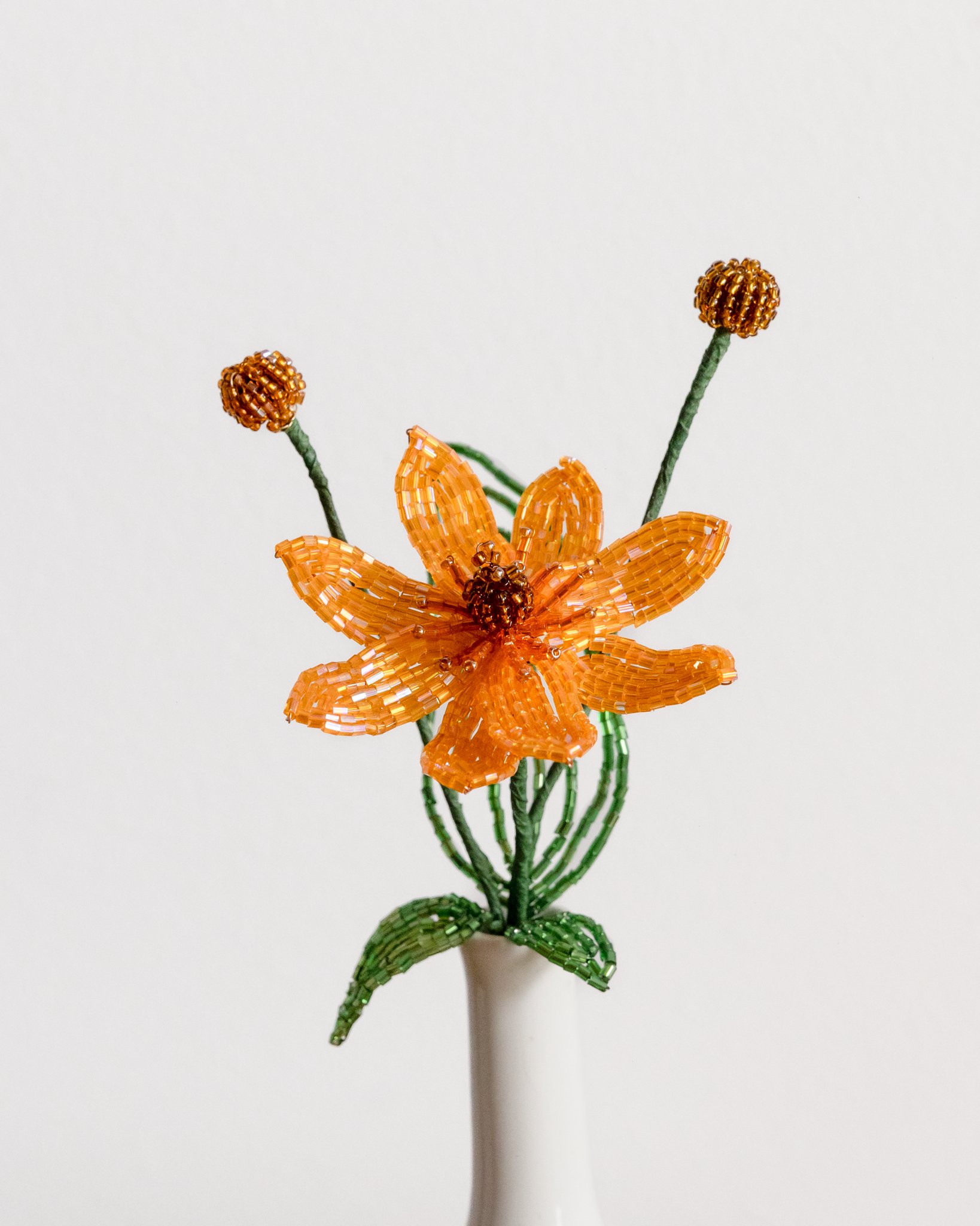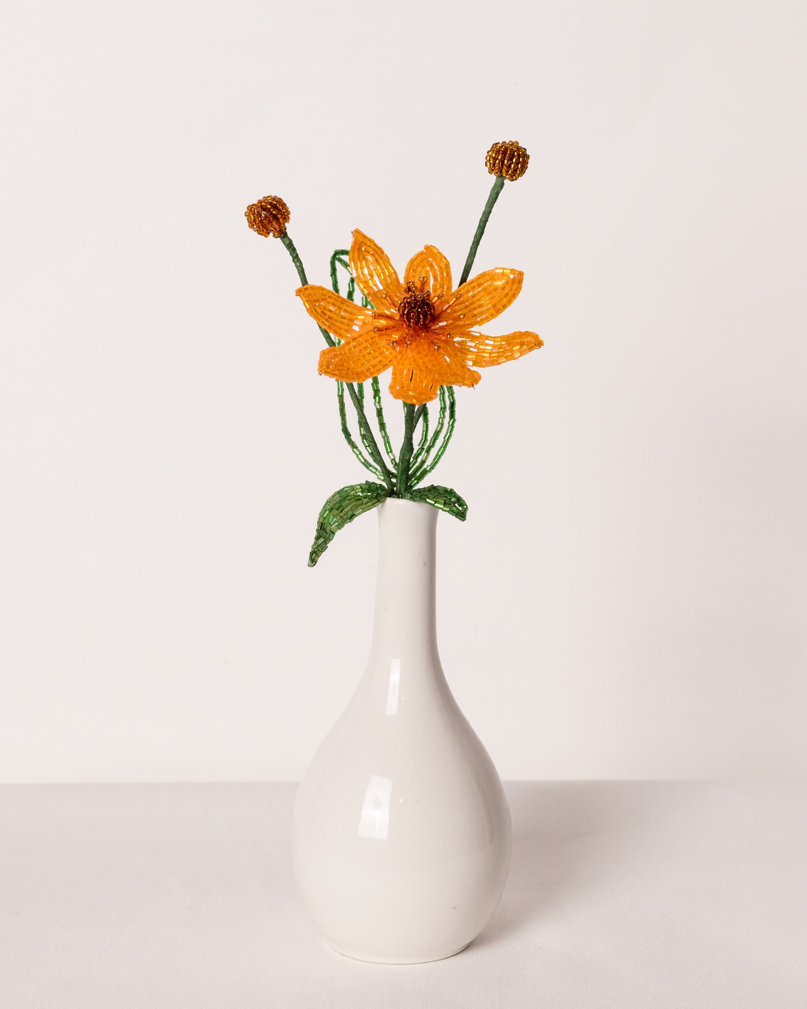 A hand crafted single-stem french beaded orange flower with foliage, in a recycled ceramic vase.